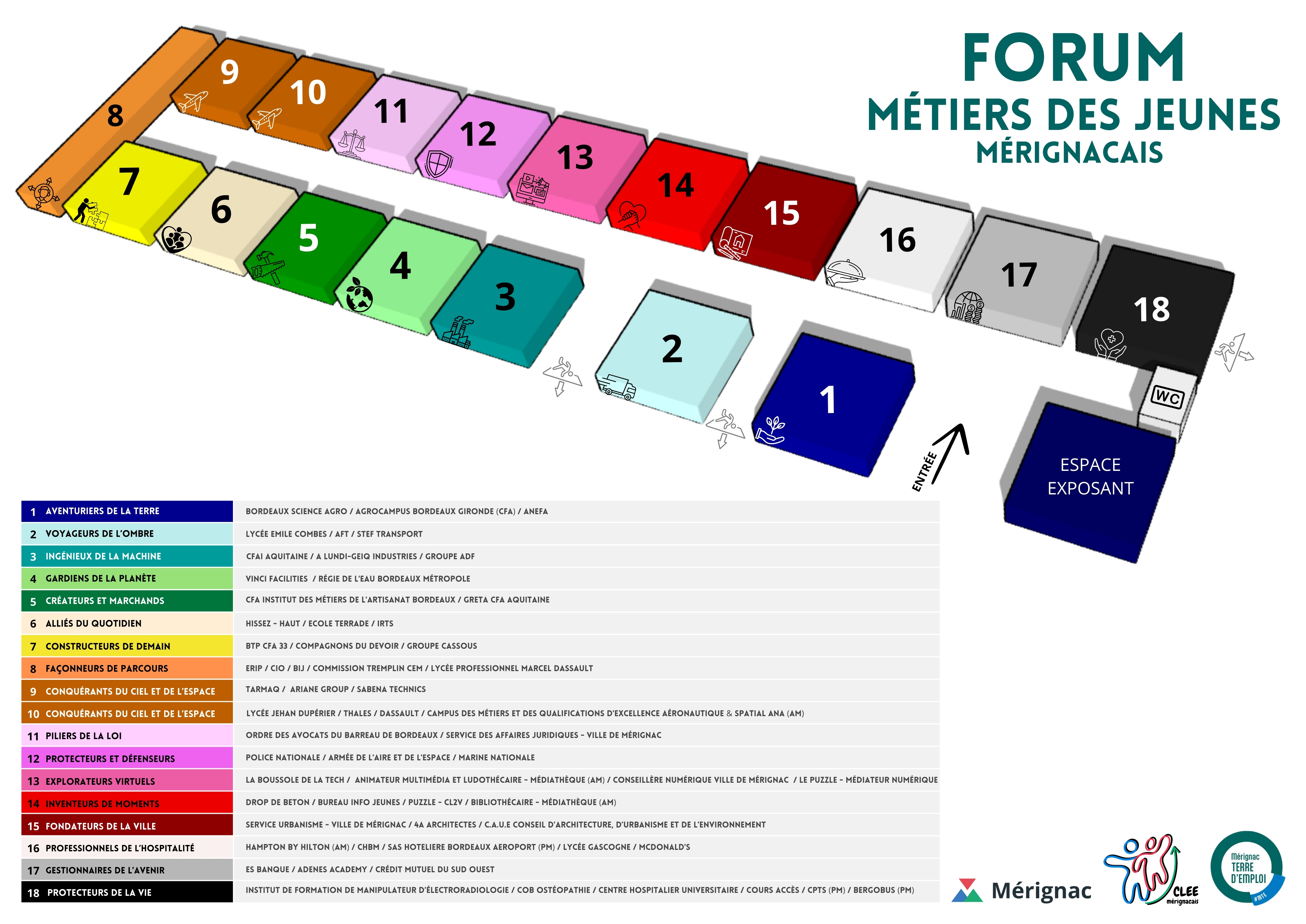 Fil d'Ariane Page d'accueil Actualités Le Forum Métiers des Jeunes Mérignacais : un carrefour d’exploration pour la jeunesse locale Le Forum Métiers des Jeunes Mérignacais : un carrefour d’exploration pour la jeunesse locale Le Forum Métiers des Jeunes Mérignacais fait son grand retour pour une 5ème édition le 16 décembre 2025, de 10h30 à 12h30 et de 14h à 16h00, au Pavillon du Pin Galant. partager sur 04/12/2025 Organisé par le Comité Local École-Entreprise (CLEE) avec le soutien de la Ville de Mérignac, cet événement offre aux collégiens une immersion concrète dans le monde professionnel.Près de 830 élèves de 3ᵉ des collèges Bourran, Capeyron, Les Eyquems, Gisèle Halimi et du lycée Marcel Dassault viendront découvrir une large palette de métiers, échanger avec des professionnels et imaginer leur avenir. Objectif : créer un lien fort entre l’école et le tissu économique local, pour aider chaque jeune à se projeter et à s’inspirer. Découverte de la diversité des métiers du territoire Le FMJM consolide sa réputation d'événement fédérateur en réunissant plus de 90 intervenants issus de 17 secteurs d’activités. Les élèves auront ainsi l'opportunité d'interagir avec des professionnels œuvrant dans les domaines : 1. AgricultureBordeaux Science Agro / Agrocampus Bordeaux Gironde (CFA) / ANEFA2. Transport et logistiqueLycée Emile Combes / AFT / STEF Transport3. IndustrieCfai aquitaine / A lundi-geiq industries / Groupe ADF4. Énergie et environnement Vinci Facilities / Régie de L'Eau Bordeaux Métropole5. Artisanat et commerce CFA Institut des Métiers de l'Artisanat Bordeaux / Greta CFA Aquitaine / Les Sisterettes6. Soin et service à la personneHissez - haut / École Terrade / IRTS7. BTPBTP CFA 33 / Compagnons du devoir / GROUPE CASSOUS / Ambassadeurs métiers 8. Aéronautique, spatial Tarmaq / Ariane group / Campus des Métiers et des Qualifications d'Excellence Aéronautique & Spatial ANA (AM)9. Aéronautique, spatial Lycée Jehan Dupérier / THALES / Sabena technics / Dassault10. Droit et justiceOrdre des avocats du Barreau de bordeaux / Service des affaires juridiques - Ville de Mérignac11. Défense et sécurité Police nationale / Armée de l'aire et de l'espace / Marine nationale / CIRFA12. Informatique et numérique La Boussole de la Tech / animateur multimédia et ludothécaire - médiathèque / conseillère numérique Ville de Mérignac / le puzzle - médiateur numérique13. Animation, tourisme et cultureDrop de béton / Bureau Info Jeunes / Puzzle - CL2V / Bibliothécaire - médiathèque 14. Architecture et urbanismeService urbanisme - Ville de Mérignac / 4A architectes / C.A.U.E Conseil d’architecture, d’urbanisme et de l’environnement 15. Hôtellerie et restaurationHampton by Hilton / CHBM / SAS HOTELIERE BORDEAUX AEROPORT / Lycée gascogne / McDonald's16. Banque et assuranceES Banque / Adenes Academy / Crédit Mutuel du Sud Ouest18. Santé et bien-êtreInstitut de Formation de Manipulateur d’Électroradiologie / COB Ostéopathie / Centre hospitalier universitaire / cours accès / CPTS (AM) / Bergobus (AM)Pour l'orientation des jeunes : ERIP / CIO / BIJ / commission tremplin CEM / Lycée Professionnel Marcel Dassault Le CLEE Mérignacais cultive les vocations depuis 2018 Depuis 2018, le Comité local école-entreprise (CLEE) s'implique aux côtés des collégiens de Mérignac pour les sensibiliser au monde professionnel. Mis en place par l'Éducation nationale, le CLEE est un dispositif volontaire visant à fournir aux élèves une première expérience du monde du travail. À Mérignac, cette démarche est portée par deux co-animatrices engagées : Aude Michel, directrice franchisée de McDonald's , et Magali Domicile, principale adjointe du collège de Bourran, qui participent activement à la mise en œuvre de ces actions. Tout au long de l’année, le CLEE, à travers l'initiative Objectif Vocations, organise des visites permettant aux élèves de découvrir une variété de métiers. Pour en savoir plus Vous souhaitez obtenir plus d'informations sur l’évènement ? Contactez la Mission Développement Economique de la Ville : economie@merignac.com partager sur À lire aussi 31/12/2025 Direction de la communication Les voeux de Thierry Trijoulet aux Mérignacais En savoir plus 31/12/2025 Proximité, espace public Bien réveillonner, c’est aussi #Bienrentrer ! En savoir plus 30/12/2025 Proximité, espace public Déposez votre sapin dans les points de collecte En savoir plus
