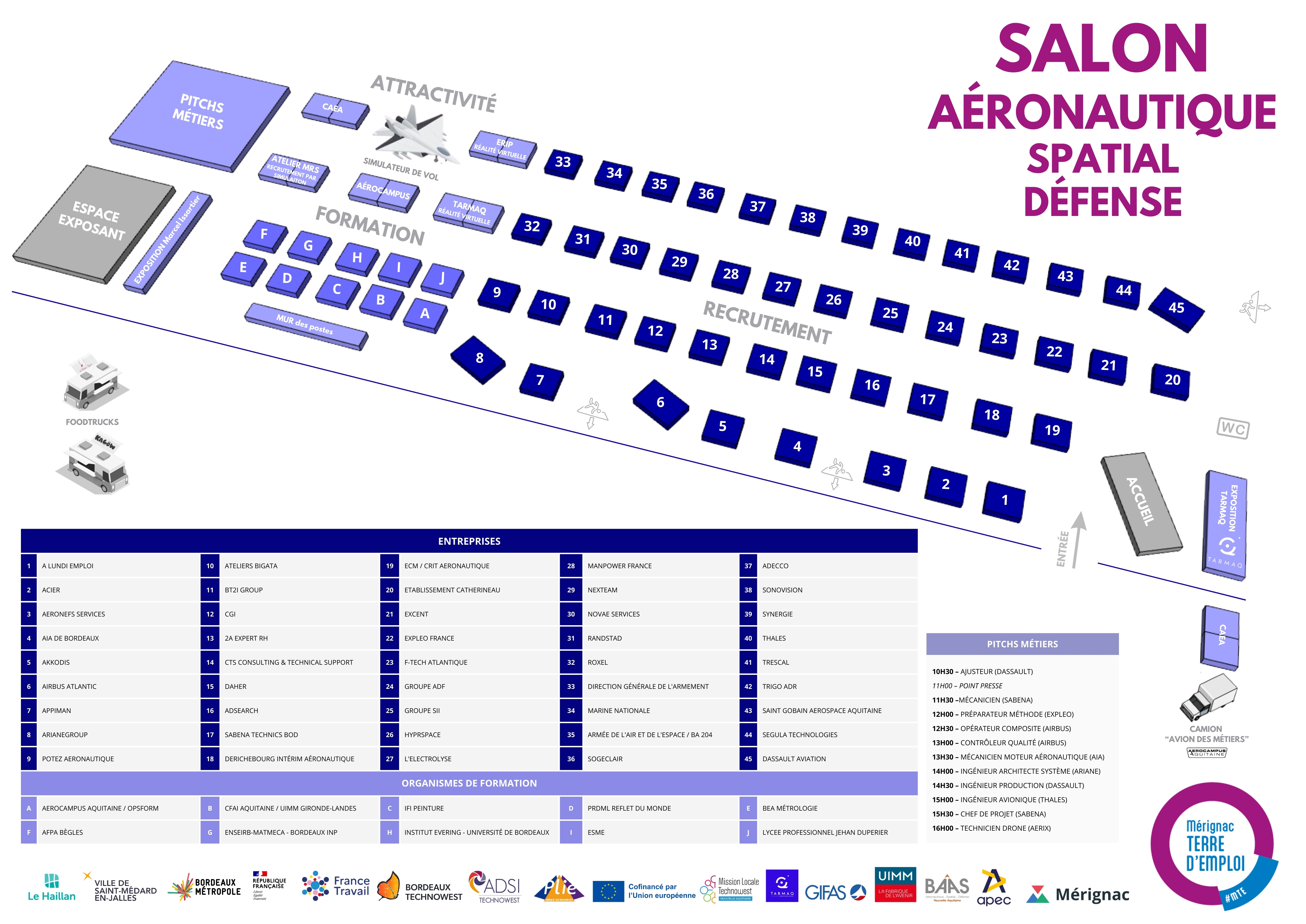 Fil d'Ariane Page d'accueil Actualités Salon Aéronautique, Spatial, Défense : Emploi et Formation Salon Aéronautique, Spatial, Défense : Emploi et Formation Le Salon Aéronautique, Spatial et Défense (ASD) fera son retour le mardi 28 avril 2026, de 10h à 17h, au Pavillon du Pin Galant. Cet événement, gratuit et ouvert à tous, est co-organisé par la Ville de Mérignac et France Travail, en partenariat avec Saint-Médard-en-Jalles, Le Haillan, Bordeaux Métropole, l’ADSI-PLIE Technowest, le Rectorat, la Mission Locale Technowest, Tarmaq, le GIFAS, l’UIMM, BAAS et l’APEC. Véritable tremplin professionnel, ce salon vise à dynamiser le secteur et à mettre en lumière ses opportunités de carrière. partager sur 05/02/2026 Un espace dédié au recrutement et à la découverte des métiersTout au long de la journée, les visiteurs auront l’opportunité de rencontrer 47 entreprises, proposant plus de 1 500 offres d’emploi, ainsi que 10 organismes de formation. Afin de rendre l’expérience encore plus immersive, le salon proposera un espace dédié à l’attractivité des métiers, avec un simulateur de vol, des pitchs métiers en continu, des casques de réalité virtuelle, des ateliers pratiques et des expositions thématiques. Une zone de restauration avec des foodtrucks sera également accessible sur place.Les structures présentes : Les entreprises : A LUNDI EMPLOIACIERAERONEFS SERVICES AIA DE BORDEAUXAKKODISAIRBUS ATLANTICAPPIMANARIANEGROUPPOTEZ AERONAUTIQUEATELIERS BIGATABT2I GROUPCGICRIT AERONAUTIQUECTS CONSULTING & TECHNICAL SUPPORTDAHERADSEARCHSABENA TECHNICS BODDERICHEBOURG INTÉRIM AÉRONAUTIQUEECM / CRIT AERONAUTIQUEETABLISSEMENT CATHERINEAUEXCENTEXPLEO FRANCEF6TECH ATLANTIQUEGROUPE ADFGROUPE SIIHYPRSPACEL'ELECTROLYSEMANPOWER FRANCENEXTEAMNOVAE SERVICESRANDSTADROXELDIRECTION GÉNÉRALE DE L4ARMEMENTMARINE NATIONALEARMÉE DE L'AIR ET DE L'ESPACESOGECLAIRLes organismes de formations : AEROCAMPUS AQUITAINE : OPSFORMCFAI AQUITAINE : UIMM GIRONDE-LANDES IFI PEINTUREPRDML REFLET DU MONDEAFPA BEGLES ENSEIRB-MATMECA - BORDEAUX INPINSTITUT EVERING - UNIVERSITÉ DE BORDEAUXESME Nouvelle-Aquitaine : Un Pôle d’Excellence pour l’ASDTroisième région française pour l’industrie aéronautique, spatiale et de défense, la Nouvelle-Aquitaine se distingue comme leader en aéronautique de défense et deuxième région d’implantation des forces armées. Cette dynamique s’appuie sur un écosystème solide réunissant grands industriels (Dassault Aviation, Safran, ArianeGroup, Thales), PME, ETI et acteurs de la formation, essentiels à la montée en compétences des futurs professionnels.Avec des secteurs d’excellence allant de la gestion des turbines aux systèmes de drones, en passant par la maintenance et l’aménagement aéronautique, la région offre de nombreuses opportunités de carrière. Pour en savoir plus : Vous souhaitez obtenir davantage d'informations sur le Salon Aéronautique, Spatial, Défense : Emploi et Formation ? Contactez la mission développement économique : economie@merignac.com partager sur À lire aussi 19/03/2026 Le conseil municipal d'installation se tiendra le 21 mars En savoir plus 17/03/2026 Commerces et évènementiels de proximité Gyraya, une pause déjeuner aux accents grecs En savoir plus 17/03/2026 Éducation, enfance, jeunesse Découvrez la carte jeune Bordeaux Métropole En savoir plus