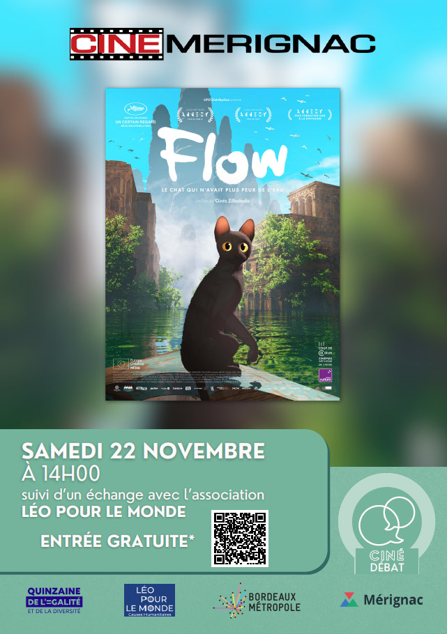 Fil d'Ariane Page d'accueil Agenda Ciné-débat du film "Flow, le chat qui n’avait plus peur de l’eau" Cinéma - Projection Ciné-débat du film "Flow, le chat qui n’avait plus peur de l’eau" Informations pratiques Date 22/11/2025 à 14h Autres informations utiles Public concerné : Tout âge Lieu Mérignac Ciné 6 Pl. Charles de Gaulle, 33700 Mérignac, France Centre-ville partager sur Projection du film d’animation de Gints Zilbalodis, suivie d’un échange avec l’association Léo pour le monde sur le vivre-ensemble.Télécharger le flyer pour plus d'informationsInformations pratiquesSamedi 22 novembre à 14hAu Mérignac-CinéTout publicGratuit, sur réservation sur cinemerignac.fr Places gratuites financées par la ville et la métropole dans le cadre de la quinzaine de l’égalité Les autres événements qui pourraient vous intéresser Découvrez Mérignac autour de ses événements Animation - Atelier Le 04/12/2025 à 09h30 Le cercle parents-bébés du 4 décembre La Glacière Conférence - Rencontre - Débat Le 04/12/2025 à 15h Conférence « Le bestiaire médiéval sculpté au Moyen-Âge » Centre-ville Conférence - Rencontre - Débat Le 04/12/2025 à 17h Atelier philo "Vivre ensemble" Centre-ville Voir tous les événements
