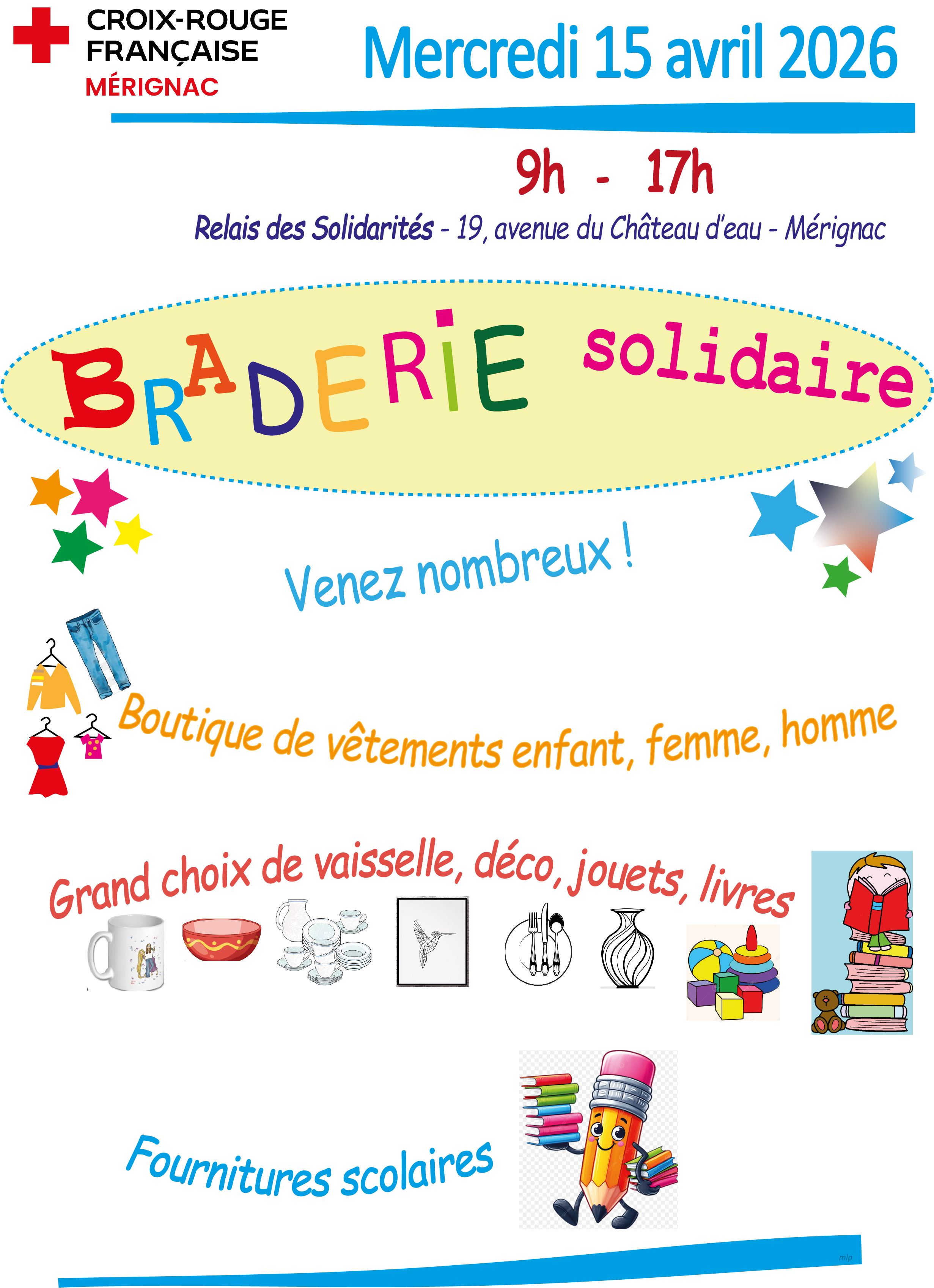 Fil d'Ariane Page d'accueil Agenda Déstockage solidaire au Relais des solidarités Vide grenier - Brocante - Marché Déstockage solidaire au Relais des solidarités Des vêtements et des jeux, jouets à prix mini ! Informations pratiques Date 15/04/2026 à 09h Autres informations utiles Public concerné : Tout âge Lieu Relais des solidarités 19 Av. du Château d'Eau, 33700 Mérignac, France Capeyron partager sur La Croix-Rouge française - Unité Locale de Mérignac organisera le mercredi 15 avril de 9h à 17h un déstockage solidaire ! Forte de son succès de l'an dernier, nous vous invitons à découvrir et acheter des vêtements, objets, vaisselle, jeux, jouets à prix mini ! La somme récoltée servira à faire perdurer nos actions ! Nous vous attendons nombreuses et nombreux !Site web de l’évènementhttps://www.croix-rouge.fr/unite-locale-de-merignac/destockage Informations pratiquesMercredi 15 avril 2026 de 9h à 17hEntrée libreTout publicArrêt bus 16 : Capeyron Les autres événements qui pourraient vous intéresser Découvrez Mérignac autour de ses événements Animation - Atelier Le 01/04/2026 à 09h30 Yoga prénatal Capeyron Fête - Festival - Grands évènements Le 01/04/2026 à 14h Carnaval de la jeunesse Centre-ville Fête - Festival - Grands évènements Le 01/04/2026 à 18h Quartier libre 2026 - Soirée de lancement de l'édition 2026 & Tremplin musical Centre-ville Voir tous les événements